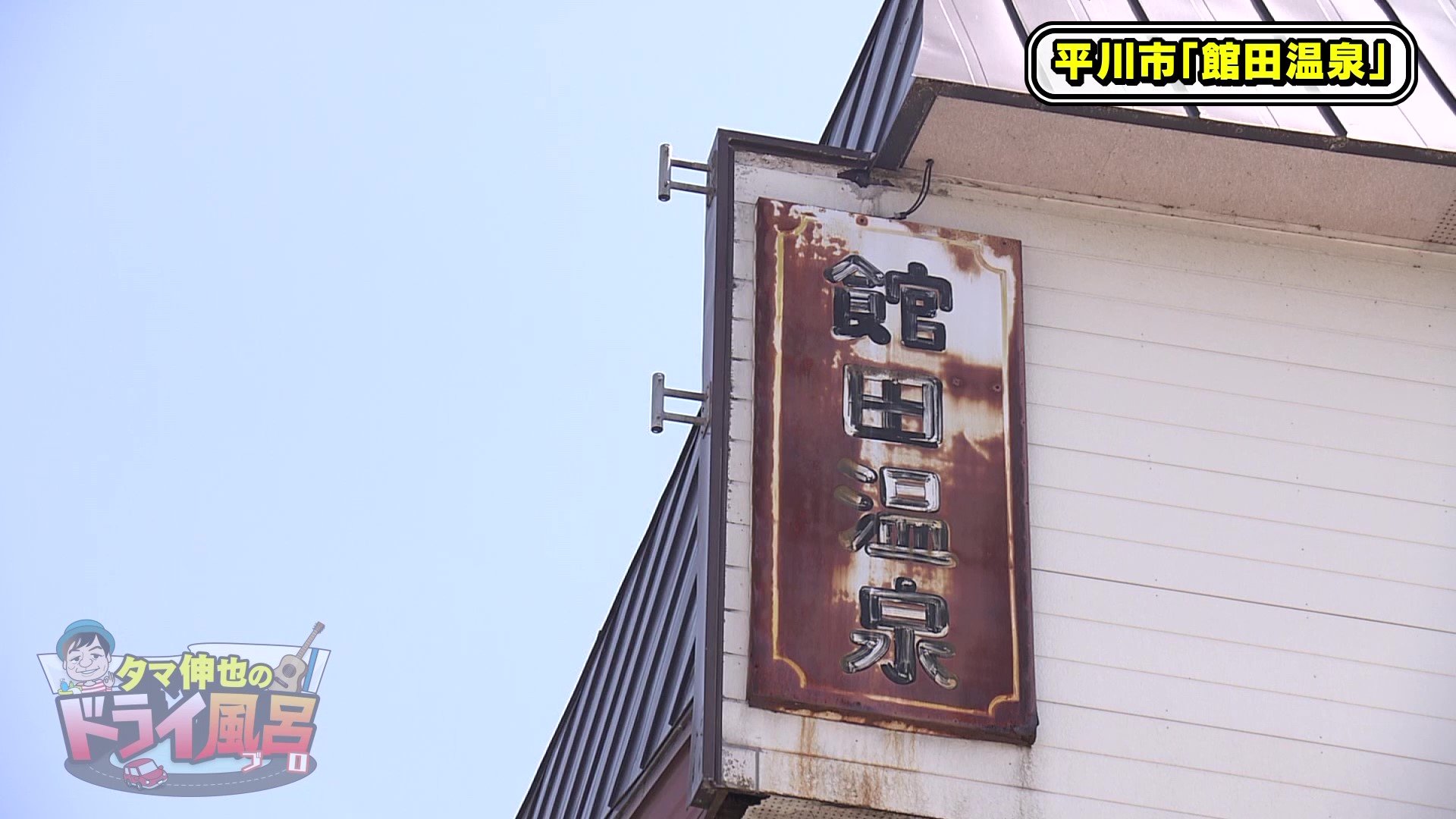 かわいい「看板猫」に会うべく平川市へとやってきた2人。見えてきたのは、この日の目的地「館田(たちた)温泉」です。味わい深い外観が好みで“外観ソムリエ”を自称するタマさんは、少し古びてどこか懐かしさを感じる外観が気に入った様子でした。