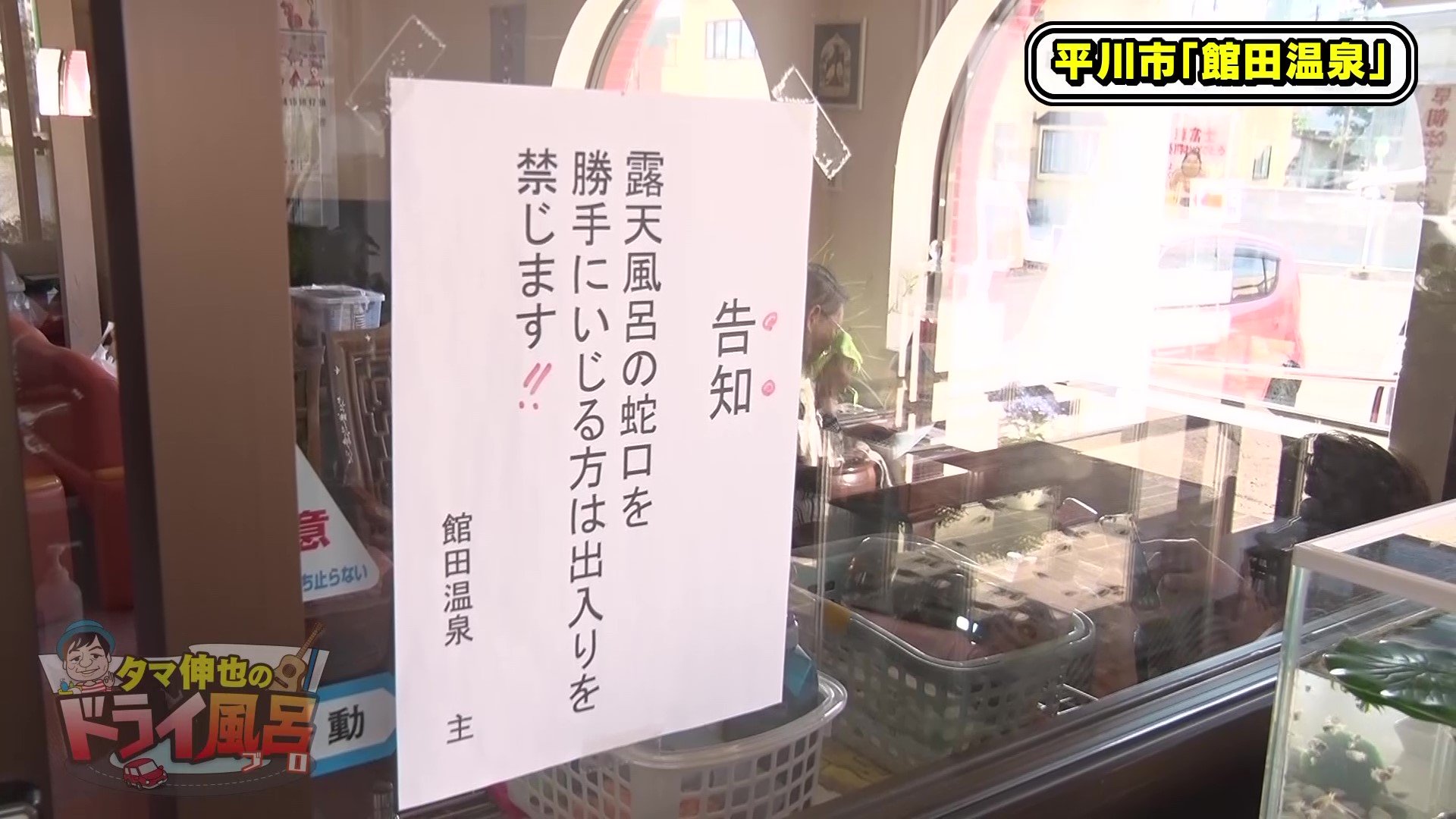 「告知 露天風呂の蛇口を勝手にいじる方は出入りを禁じます!! 館田温泉 主」