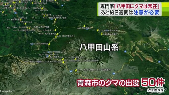 今年度は25日までに50件の出没情報が寄せられていて、八甲田山系などの山あいに集中しています。
