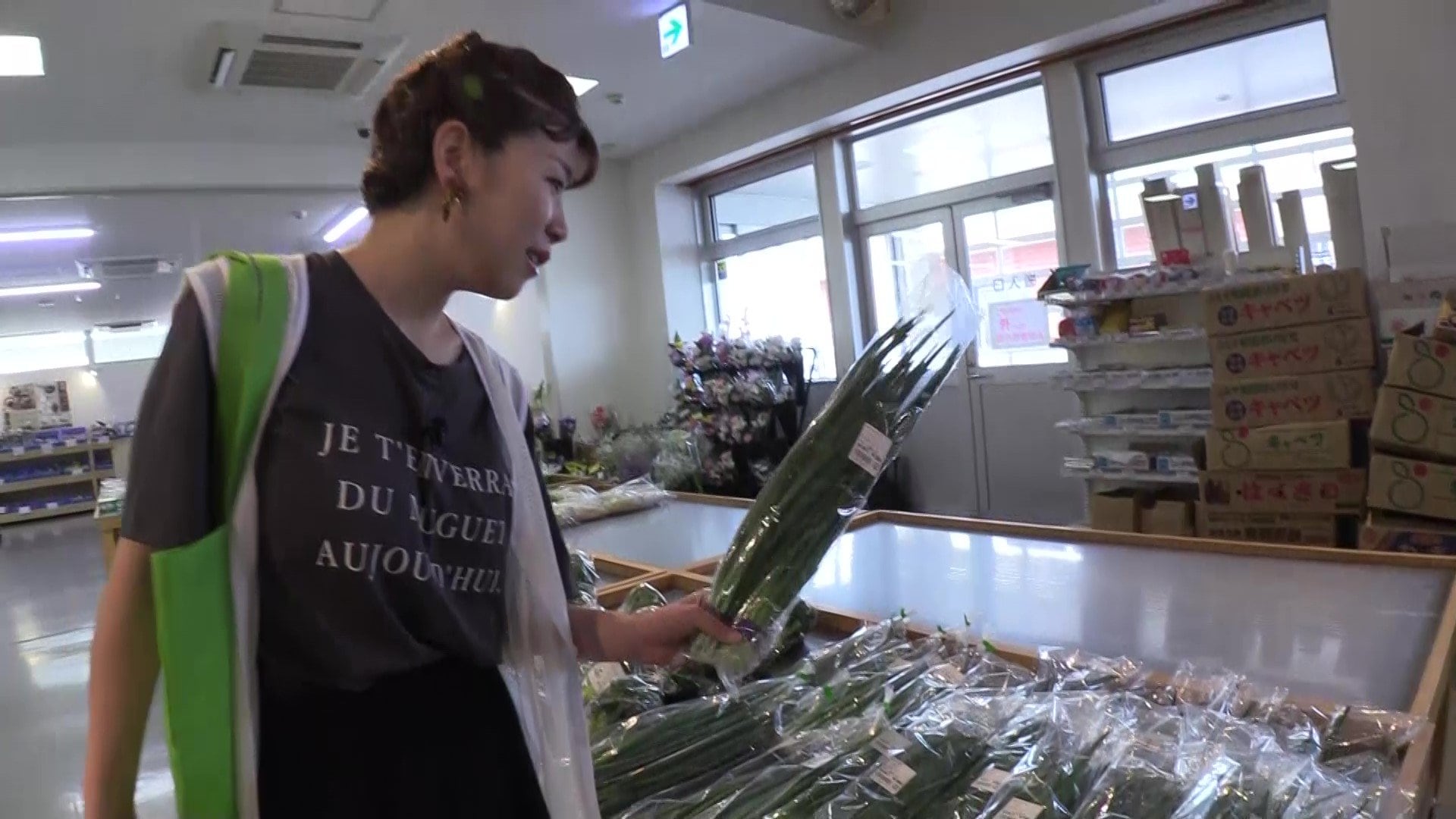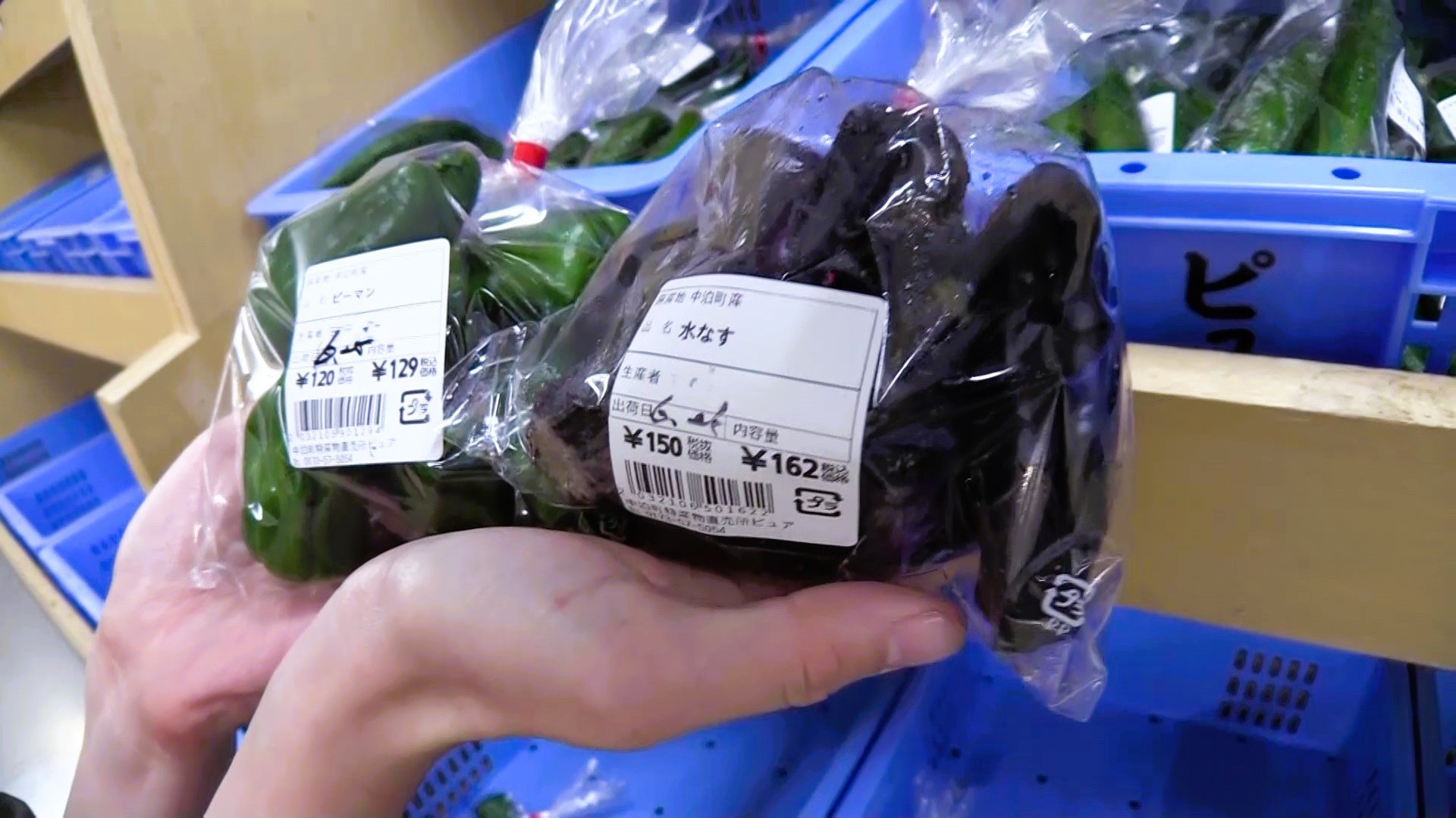 「さっき聞いたんですけど、この【水ナス】と【ピーマン】は、今年初出荷なんです。夏野菜も増えてきましたね。旬の野菜もたくさん並んでいます。【キュウリ】は9本近く入って216円。すごく安い!」