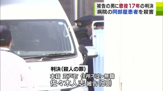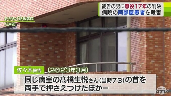 佐々木被告は2023年3月、八戸市のみちのく記念病院で、同じ病室に入院していた髙橋生悦さん(当時73歳)の首を両手で押さえつけたほか、まぶた付近に歯ブラシの柄を突き刺して殺害したとされています。