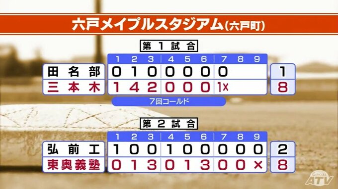 六戸メイプルでは、三本木が田名部にコールド勝ち、東奥義塾が弘前工業に勝利しました。