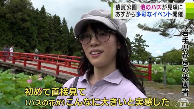 猿賀公園ではあすから「蓮の花まつり」が開かれ、8月25日までの期間中、多彩なイベントやアクティビティ体験、フォトコンテストが行われることになっています。ハスの花は7月いっぱい見頃で、お盆の頃まで楽しめるということです。