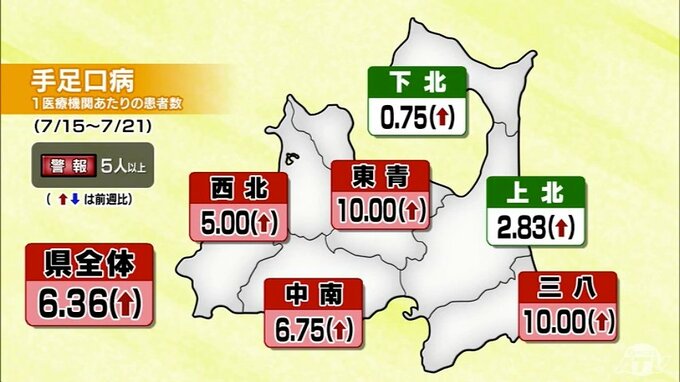口の中や手足などに発疹が出る感染症「手足口病」の感染が拡大しています。東青・中南・三八・西北の4つの保健所管内に警報が発表されました。