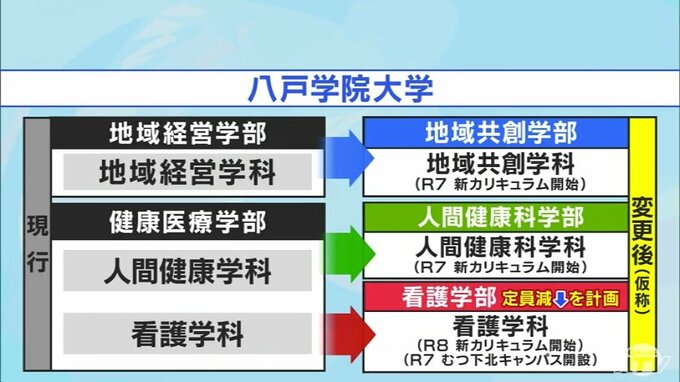 八戸学院大学(青森県八戸市)は学部体制を3学部に見直す再編構想案を発表し、人間健康学科と看護学科を学部として独立させる方針を示しました。