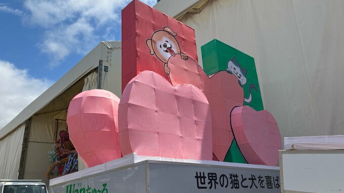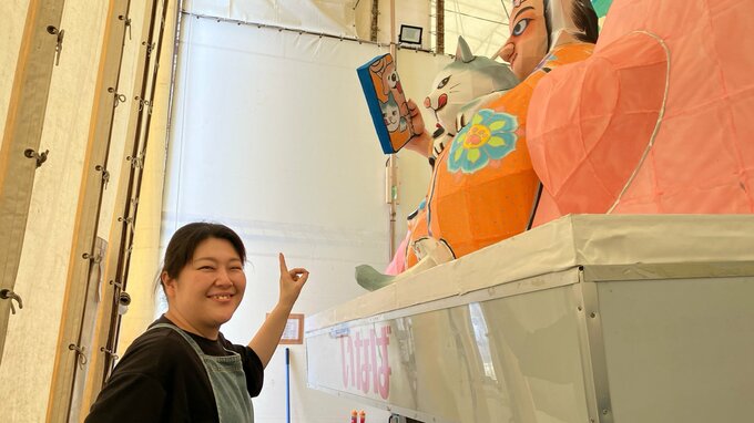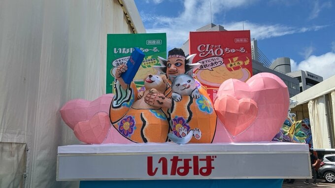 毎年ユニークで可愛らしいことで注目される「いなば食品」の前ねぶた。2024年は、イヌやネコと共にねぶたがにっこりと笑顔で自撮りをしている。この前ねぶたを制作したのは、ねぶた師の塚本利佳さん。ネコやイヌをとにかくかわいらしく表現したと話しており、自撮りをしているスマホ画面など細かな部分にも注目してほしいと話しています。