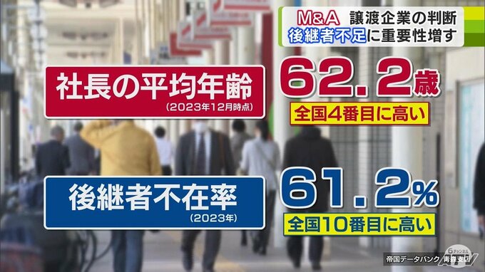 帝国データバンクによりますと、2023年12月時点の調査では青森県の社長の平均年齢は全国で4番目に高い62.2歳で後継者の不在率は61.2%と全国で10番目に高くなっています。