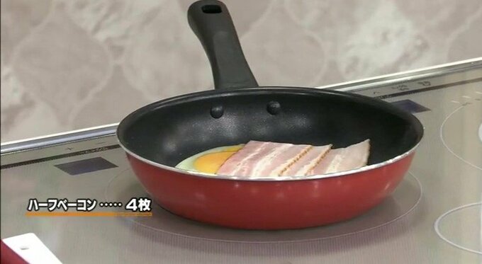 3.フライパンにサラダ油を引き、卵を割り入れる。卵の上にベーコンをのせて両面を焼く。