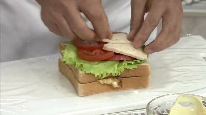 5.4にマヨネーズを塗った食パン・レタス・トマト・サラダチキンの順にのせ、塩・こしょうを振る。