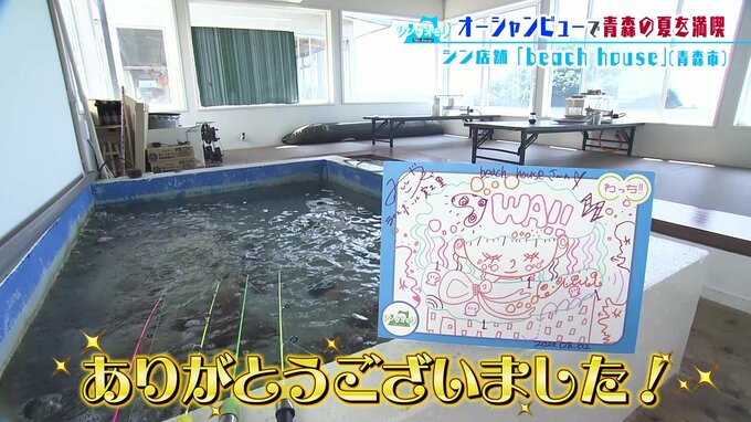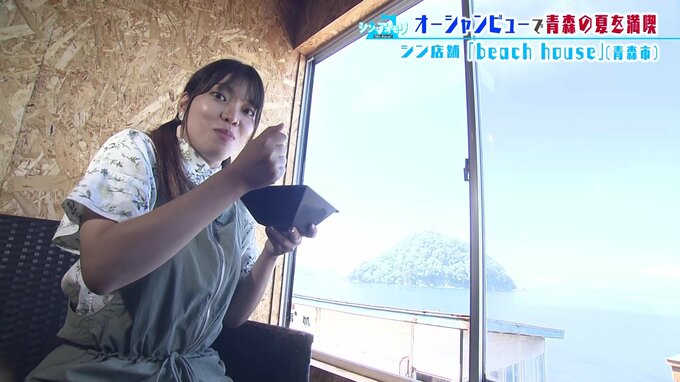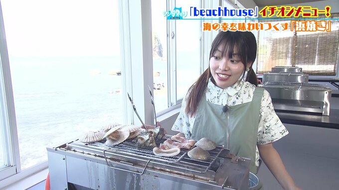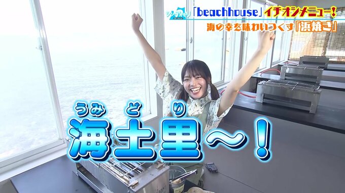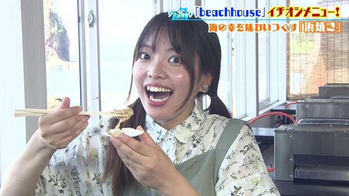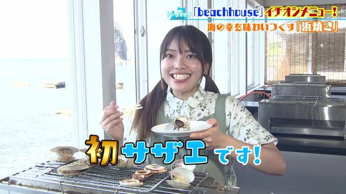 オーシャンビューの店舗で海の幸を味わうだけではなく、“釣り”やスイーツも楽しめる『beach house』。実土里さんにとっても初めての“ほたて釣り”やサザエの実食など、“シン・体験”がいっぱいの店でした。