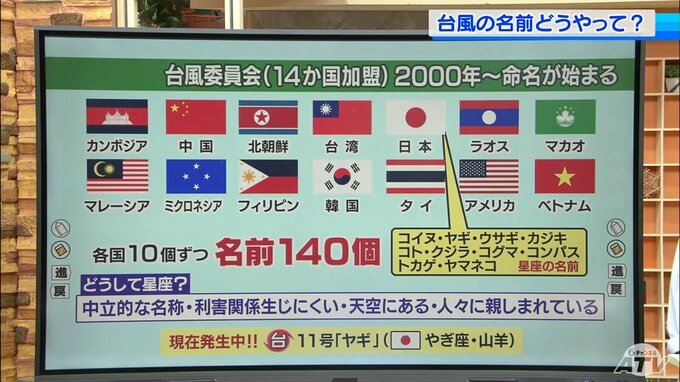 「台風委員会」なるものがありまして、環太平洋の14か国の国と地域が集まって、それぞれ10個ずつ名前を考えて合計140個ありまして、2000年からその命名が始まっているという状況です。