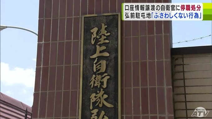 自分の口座情報を譲渡した男性自衛官に停職20日の懲戒処分 7月には詐欺などで逮捕 陸上自衛隊弘前駐屯地 2024年9月24日(火) 21:00 国内 自分名義の銀行口座の情報を第三者に譲り渡したとして、陸上自衛隊弘前駐屯地は21歳の男性自衛官を停職20日の懲戒処分にしました。 24日付で停職20日の懲戒処分を受けたのは陸上自衛隊弘前駐屯地第39普通科連隊に…