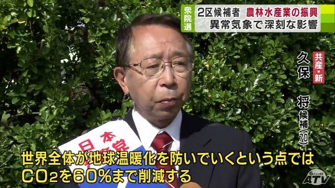 共産党の新人・久保将氏(70)は、地球温暖化対策などを訴えました。