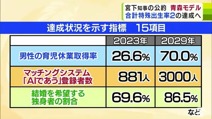 青森県の宮下宗一郎知事は、公約に掲げていた県独自の少子化対策「青森モデル」を31日に発表しました。合計特殊出生率を「2」へ引き上げるために、達成すべき数値目標を盛り込みながら74の取り組みを展開する方針です。