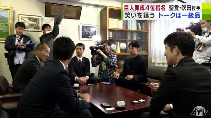 巨人から「育成4位指名」を受けた弘前学院聖愛の吹田志道投手のもとには、担当の円谷英俊スカウトたちが訪れ、開口一番「でかいなやっぱり」と188cmの長身を評価されました。