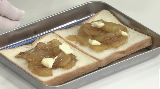 5.食パン2枚に4のりんごとクリームチーズを適量のせ、食パンでサンドする。