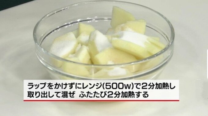 3.2のりんごを耐熱容器に入れ、グラニュー糖とレモン汁を加えラップをかけずにレンジ(500w)で2分加熱する。取り出して混ぜさらに2分加熱する。