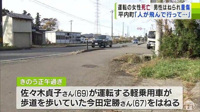 13日正午過ぎ、平内町小湊の国道4号で事故は起きました。警察によりますと、近くに住む佐々木貞子さんが運転する軽乗用車が歩道に進入し、歩いていた近くに住む今田定勝さんをはねました。その後も、車は止まらなかったということです。