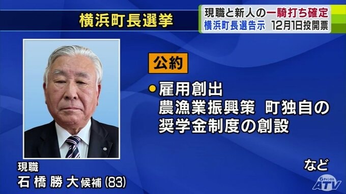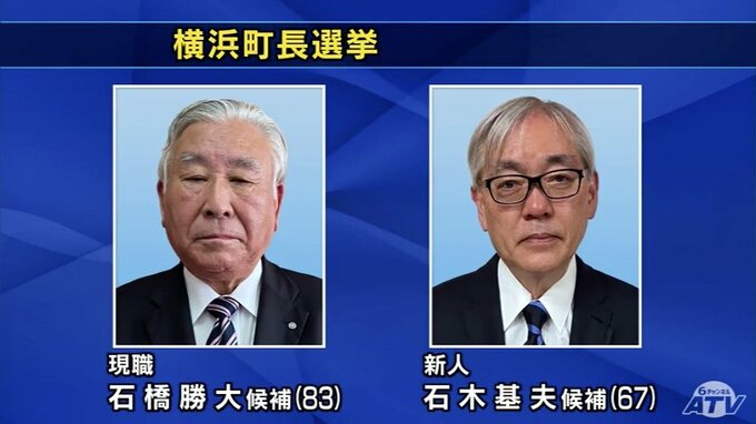 横浜町長選挙に立候補したのは届け出順に、現職で2期目を目指す石橋勝大氏(83)と、新人で医療法人理事長の石木基夫氏(67)の2人です。
