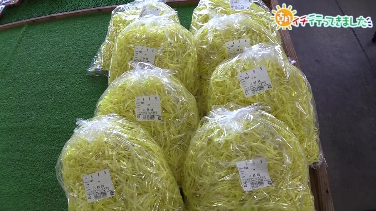 「もう今年の分は、いま出ているだけで終わりみたいです。これだけ入って200円。おひたしにしたり、なめたけと和えたりするとおいしいですよね~」