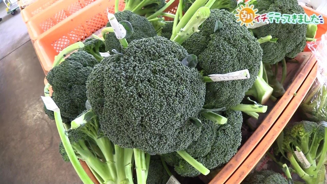 「ブロッコリーがすごい!花束のように大きいし重たい。1束で180円。春から夏ぐらいにかけて旬のブロッコリーですが、ここではハウスで育てているので、いまの時期も甘みが強くておいしいんだそうです。私の顔と比べてみてもこれぐらい。本当に大きい!こんな大きいの初めて見ました」