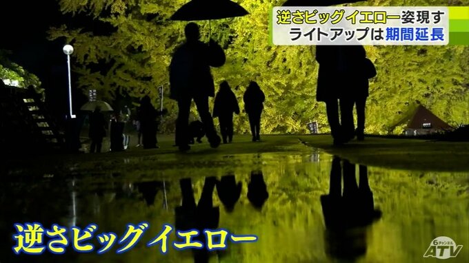 青森県深浦町北金ヶ沢の日本一の大イチョウ。その絶景を楽しもうと、多くの観光客が訪れています。28日の夜には、雨の日限定で見られる「逆さビッグイエロー」も姿を現しました。