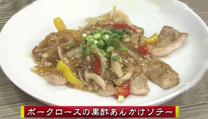 7.沸いたら水溶き片栗粉を加えてとろみをつけ、焼いた豚肉を戻し入れ黒酢あんをしっかり絡めて温める。