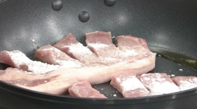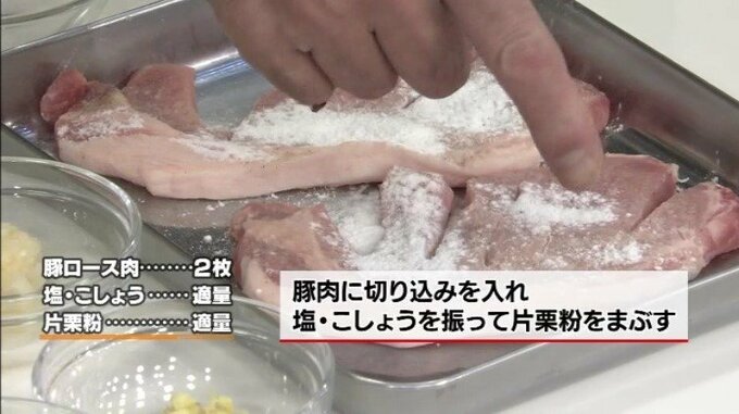 3.2の豚肉に塩・こしょうを振り、片栗粉を薄くまぶす。