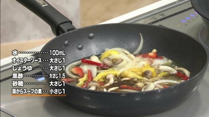 6.野菜がしんなりしたら、水・オイスターソース・しょうゆ・黒酢・砂糖・鶏がらスープの素を加え中火で煮立てる。