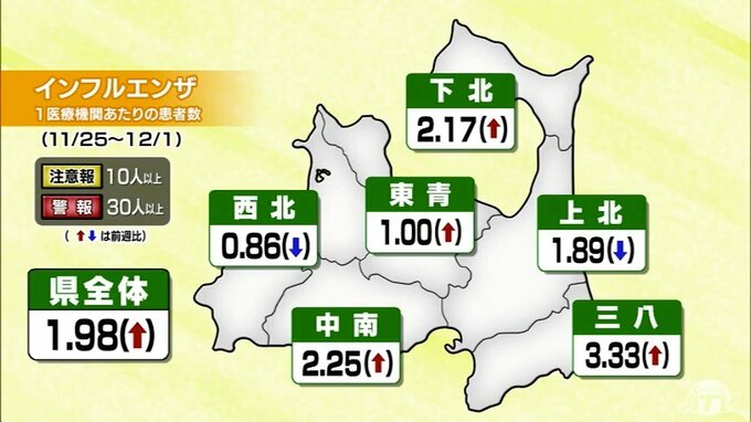 地域別では、6つ地域のうち4つの地域で前の週から患者が増えていて、1医療機関当たりでは三八で3.33人、中南で2.25人下北で2.17人などとなっています。
