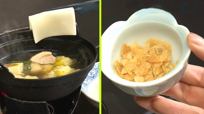 「鍋の締めとして、郷土料理のむぎかっけを入れまして、特産のニンニクチップを砕きましてお鍋に入れると、また味が楽しめます」