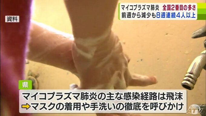 マイコプラズマ肺炎のおもな感染経路は飛沫であることから、県はマスクの着用や手洗いの徹底を呼び掛けています。