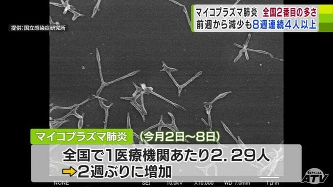 国立感染症研究所によりますと、12月8日までの1週間に全国約500の医療機関に報告された「マイコプラズマ肺炎」の患者は、1医療機関あたり2.29人で、2週ぶりに増加に転じました。