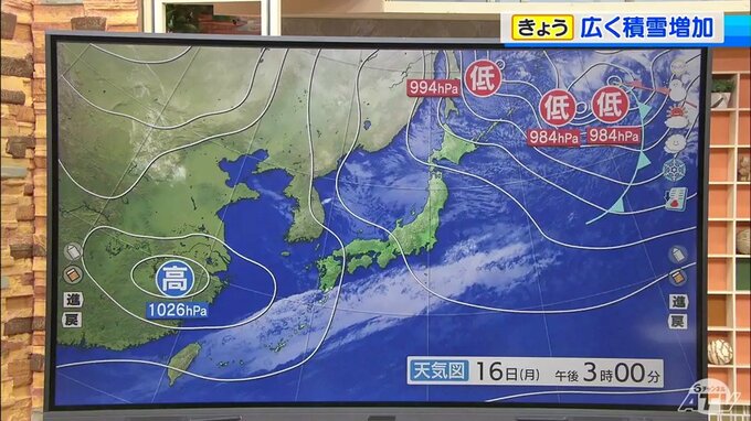 16日の天気図を見ると、日本付近は冬型の気圧配置が続いています。等圧線の間隔が広がっているため、猛吹雪はないとみられますが、強い寒気が居座ったままで、今後も大雪に注意が必要です。