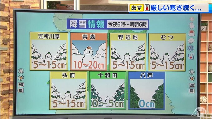16日夜~17日朝にかけては、津軽・下北・上北北部と広い範囲で雪のところが多い見込みです。積雪については、多い所で津軽・上北は最大20~30cm予想となっていますが、そのほとんどが17日の午前中で観測されるとみられます。