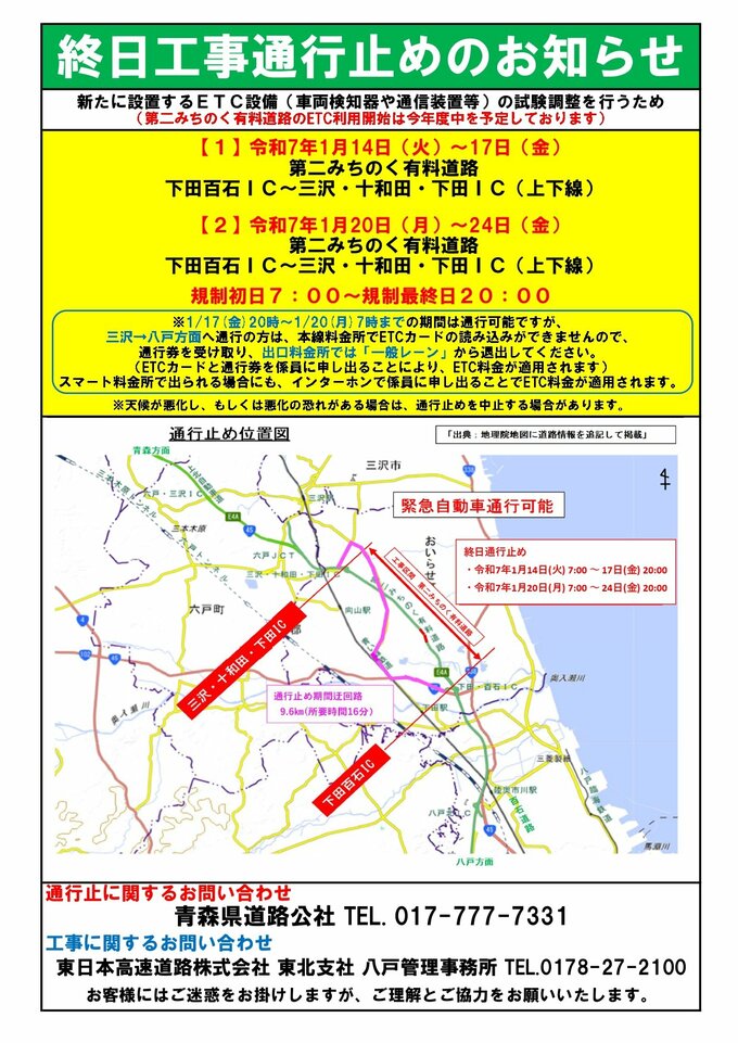 ※1月17日(金)午後8時~20日(月)午前7時までの期間は通行可能ですが、三沢→八戸方面へ通行の方は、本線料金所でETCカードの読み込みができませんので、通行券を受け取り、出口ICでは「一般レーン」から退出してください。