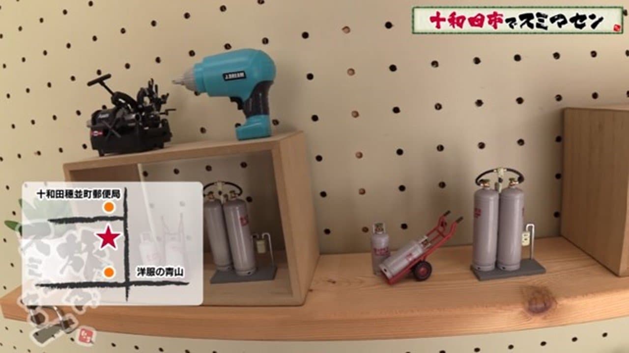 店内に飾られていたプロパンガスやボンベのミニチュアに興味津々の川口さん。