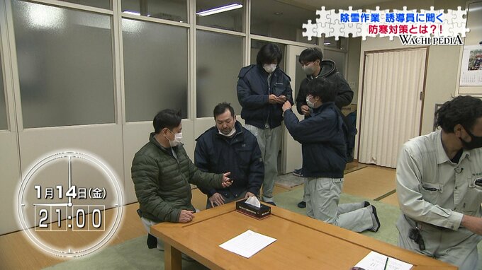 厳冬の夜9時すぎ、除雪作業のスタートは、検温やアルコールチェックなど、作業をするみなさんの体調確認からです。