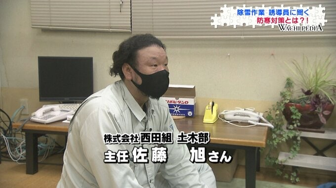 西田組 土木部主任の佐藤旭さんは、除雪車両の誘導を担当します。佐藤主任は誘導員歴20年の大ベテランです。