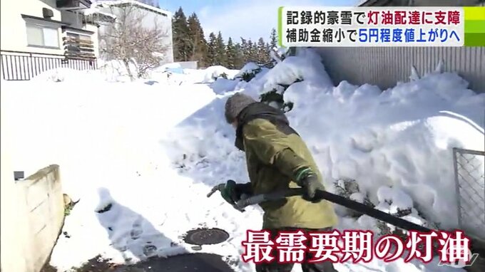 記録的“豪雪”で灯油配達にも支障「スコップで掘って給油とかも…」 来週には政府の補助金縮小で値上がりの見通し 家計には“さらに厳しい冬” 2025年1月10日(金) 21:15 国内 除排雪が行き届かない道路で、いまの時期には欠かせない灯油の配達にも支障がでています。さらに、来週には政府の補助金縮小で値上がりとなる見通しで、家計にはさらに厳しい冬の日が続くことになります。豪雪とな…