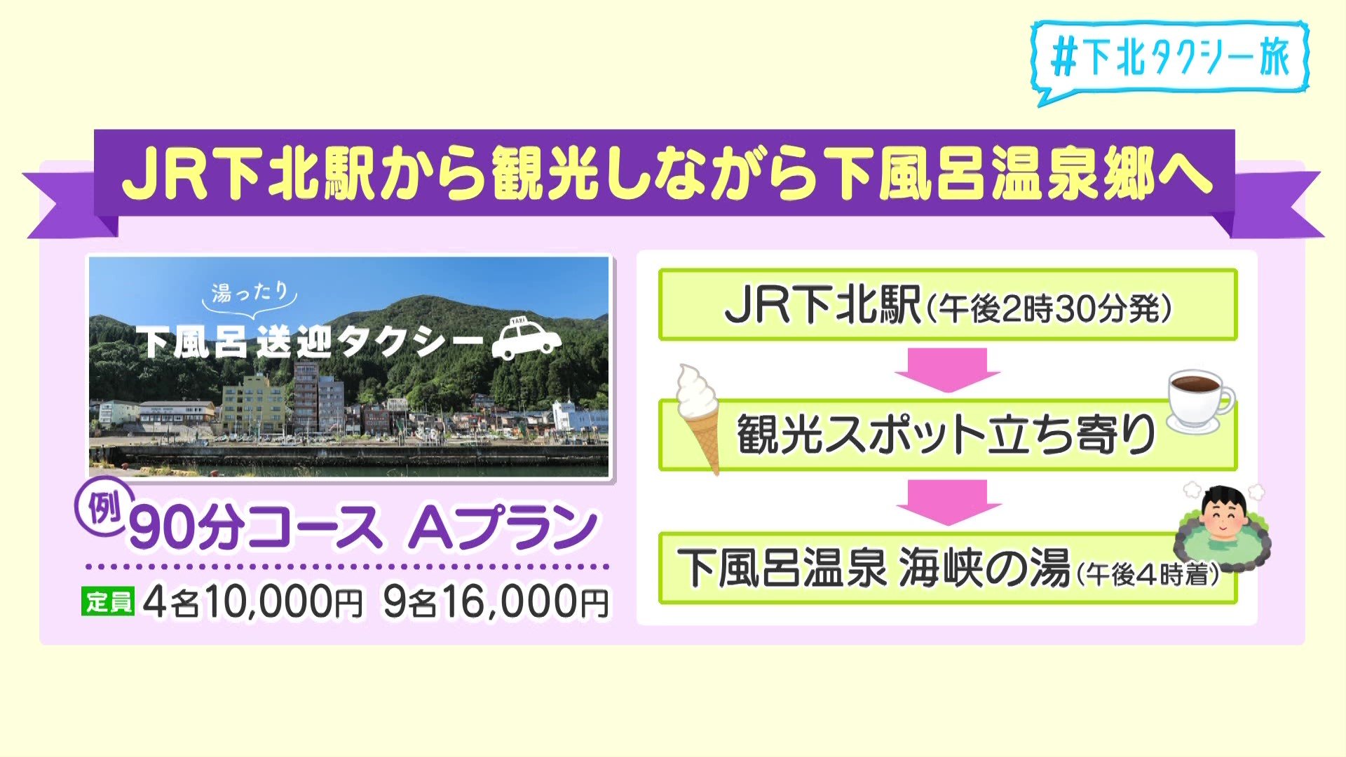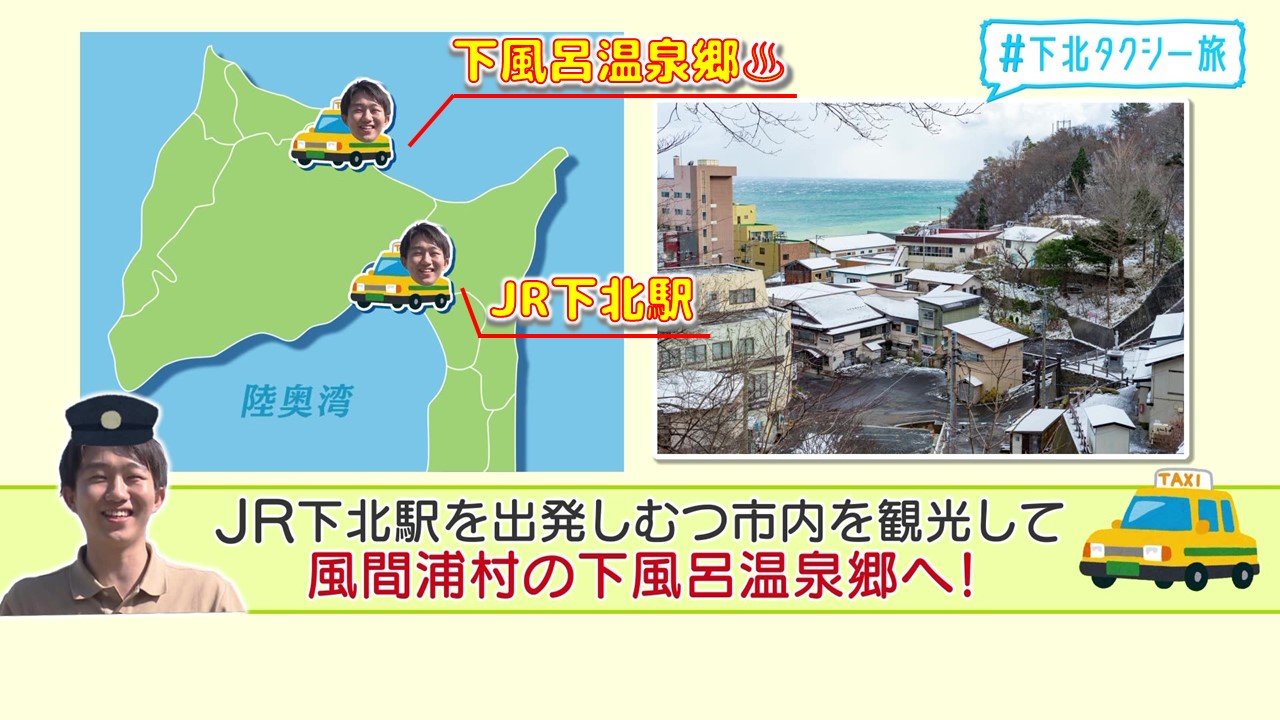 新井アナが体験したのは、【下風呂湯ったり送迎タクシー】。むつ市の『JR下北駅』と風間浦村にある『下風呂温泉郷』の間を観光スポットに立ち寄りながら、ゆったりと移動できる貸切タクシープランです。
