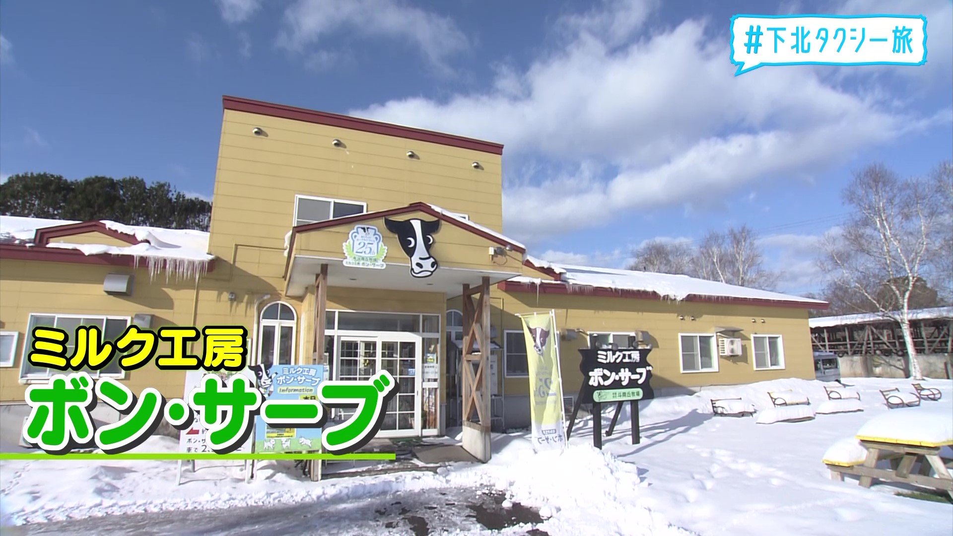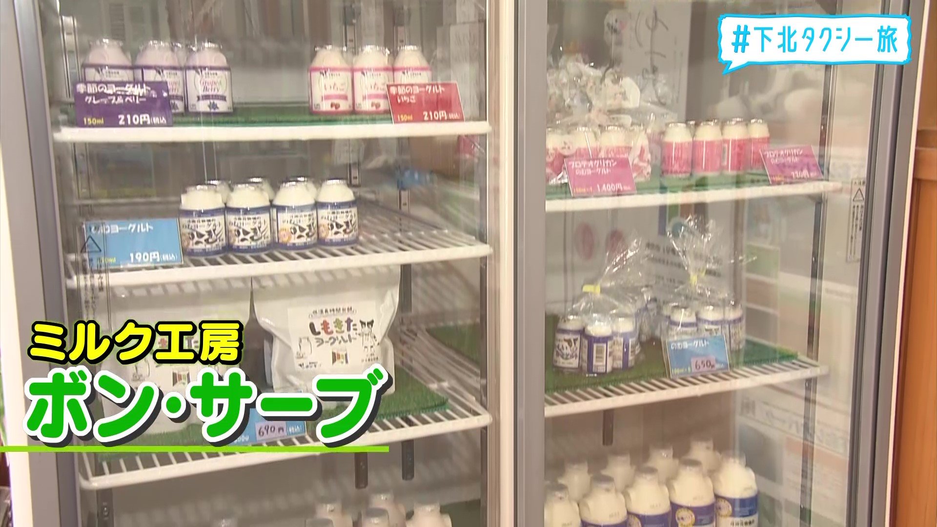 下北駅を出発して20分。新井アナが選んだ最初の立ち寄りスポット【ミルク工房ボン・サーブ】に到着しました。循環型酪農を行う斗南丘牧場で製造した牛乳をふんだんに使ったヨーグルトを購入できます。中でも『しもきたヨーグルト』は数量限定の人気商品だといいます。