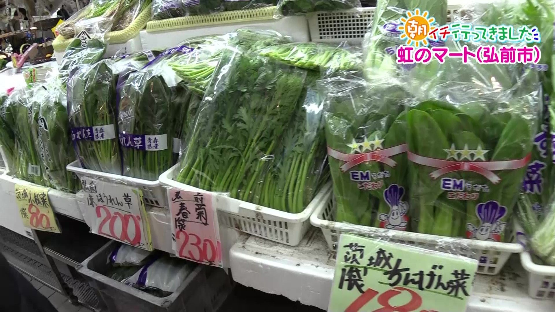次は、青果店へ。葉物野菜がたくさん並んでいました。小野寺アナが気になったのは、弘前産の『春菊』。たっぷり入って茎も太く、1袋230円でした。
