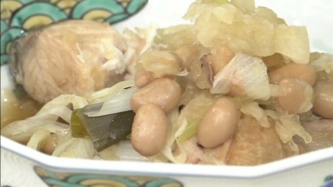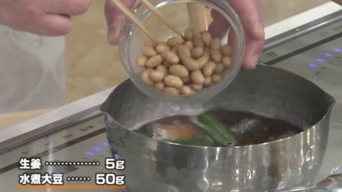 3.鍋に煮汁と1のブリを入れて火にかける。沸騰したらアクを取って火を弱め、生姜と水煮大豆を加え10~15分煮る。