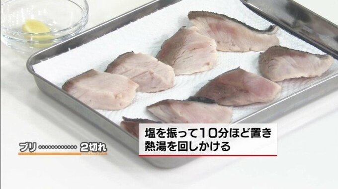 1.ブリは一口大に切り塩を振って10分ほど置き、熱湯を回しかけて霜降りにする。キッチンペーパーでしっかり水気を拭き取る。