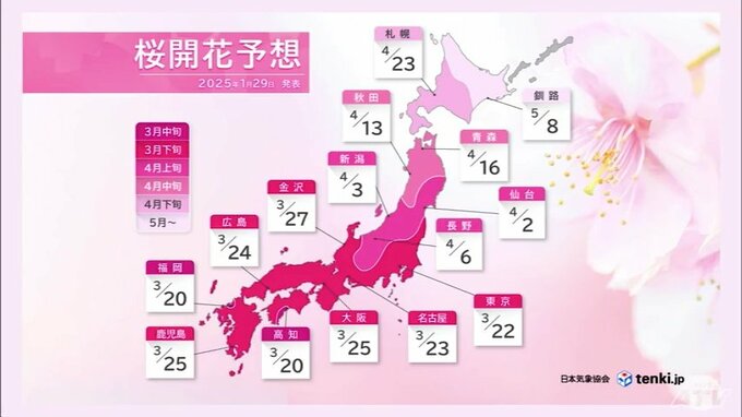 日本気象協会が29日に発表したサクラの開花予想によりますと、西日本は平年並み、東日本では平年並みか早く、北日本は平年より早いと予想されています。