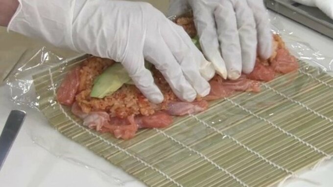 ・サーモンの刺身は厚いと巻きづらいので薄めに切り分けてください。