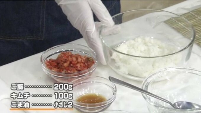 1.ボウルにご飯・刻んだキムチ・ごま油を入れて混ぜ合わせる。