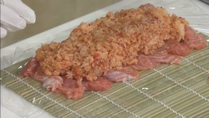 4.1のご飯をサーモンの上に広げる。この時周りに2~3センチほど余白を残す。