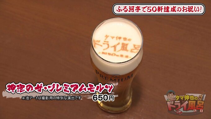 ビールを見て驚いた様子のタマさん。泡アートで「タマ伸也のドライ風呂 祝!50軒達成」と書かれてありました♪